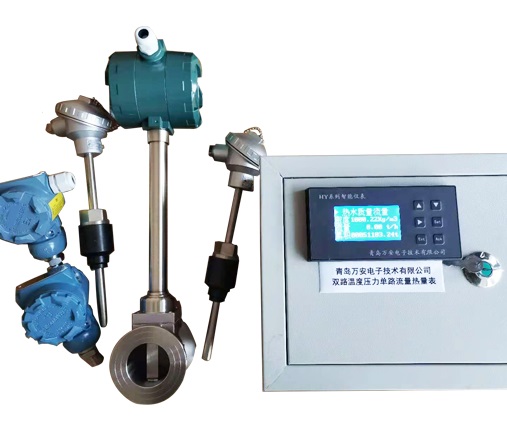 導熱油熱量表包含一台渦街流量傳感器,兩支熱電阻采集溫度信號,一台熱量表。顯示兩路溫度,一路流量。如果現場工況需要,可以分別在冷端和熱端各安裝一台渦街流量傳感器,熱量表就可以顯示兩路的溫度,兩路流量。